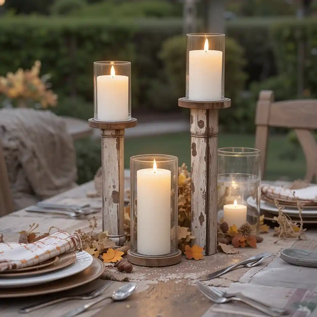Choose distressed wooden or metal candle holders for your outdoor tables. Their vintage style brings character and enhances evening ambiance.