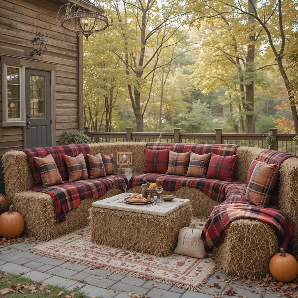 Arrange hay bales covered with plaid blankets as extra seating. This budget-friendly and charming idea blends comfort with rustic Thanksgiving style.