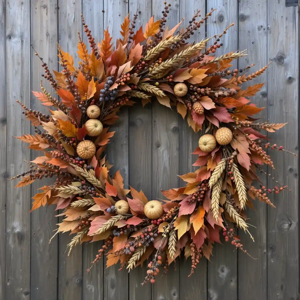 Hang large autumn wreaths made of leaves, berries, and wheat on fences or barn doors. This adds a festive focal point to your outdoor setup.