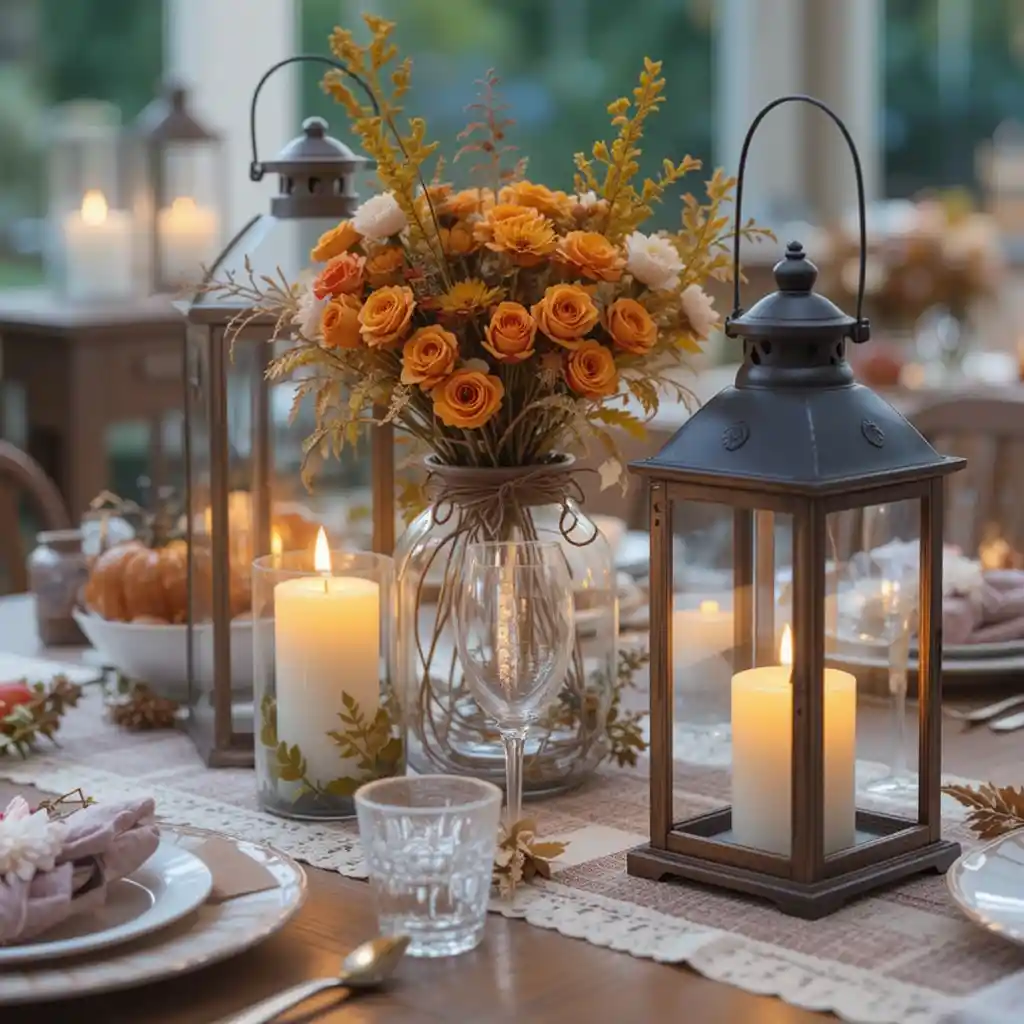 Use rustic lanterns with candles or LED lights as table centerpieces. They add warmth and charm while keeping the farmhouse theme alive.