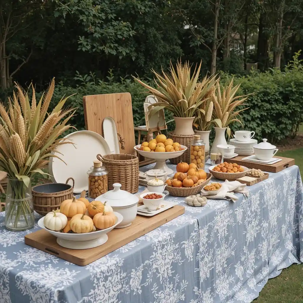 Set up a buffet table with enamelware, wooden boards, and baskets. Add seasonal decor like corn stalks and mini pumpkins to tie in the Thanksgiving look.