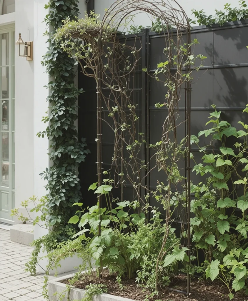 When I want a sleek, contemporary look, I go for a black metal trellis. Its clean lines create a striking contrast against lush plants. I usually place it against a white wall for maximum impact. This is one of my go-to Trellis Ideas for modern homes.