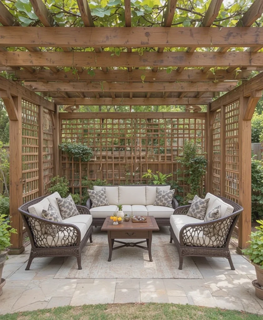 Extending a pergola with trellis panels adds depth and dimension. I use it to create shaded areas with climbing vines overhead. It transforms a simple seating area into a cozy retreat. These layered Trellis Ideas feel luxurious.