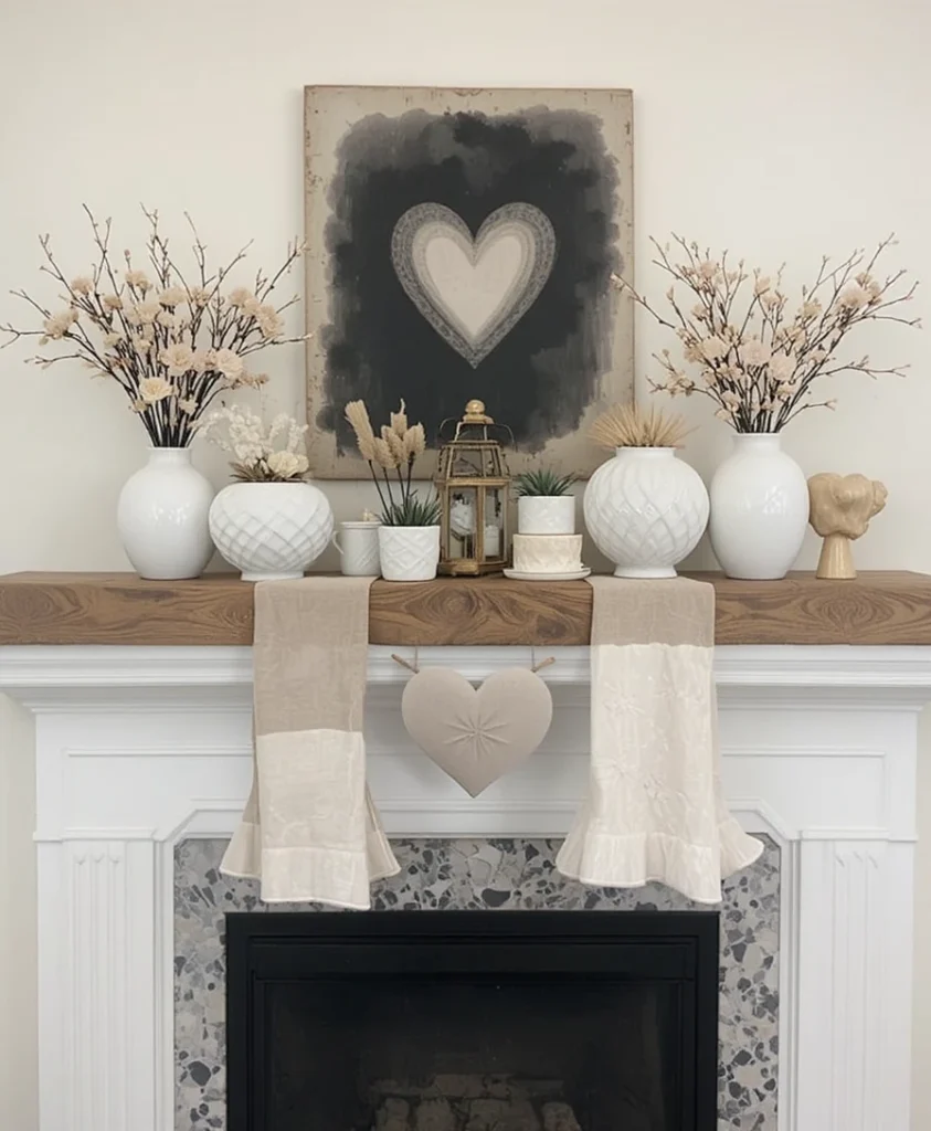 A neutral-toned valentine mantle decor setup ensures longevity and versatility. Soft whites, warm taupes, and subtle metallics come together to create an understated yet romantic display that never feels dated.