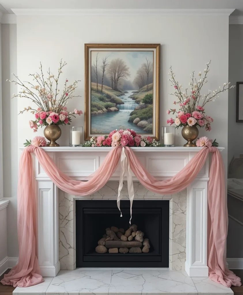 Incorporate flowing fabrics, chiffon runners, or satin ribbons for a delicate valentine mantle decor effect. Draped textures soften the mantel’s structure and add a graceful, romantic movement that feels effortlessly elegant.