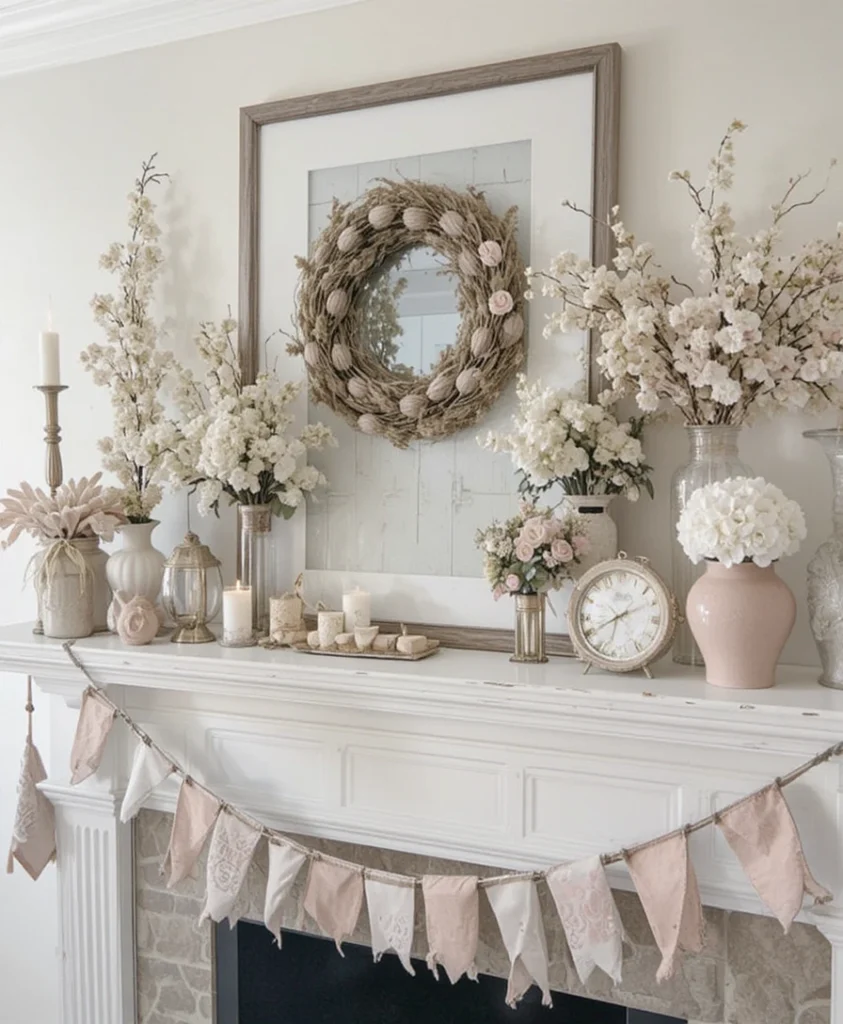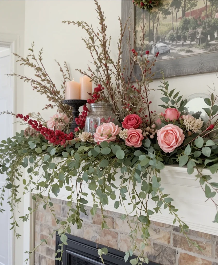 Florals never go out of style, and a cascading floral arrangement instantly elevates valentine mantle decor. Use faux or dried flowers in shades of pink, ivory, and muted red, draping them naturally across the mantel edge. This organic design adds depth, movement, and a lush visual appeal without feeling overly structured.