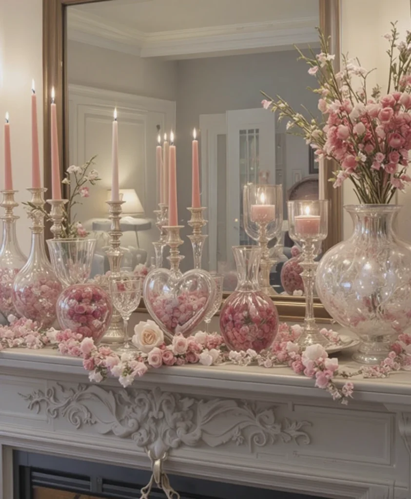 Glass décor elements reflect light beautifully, making them ideal for sophisticated valentine mantle decor. Crystal candle holders, clear vases, and subtle heart shapes enhance elegance while keeping the overall look light and refined.