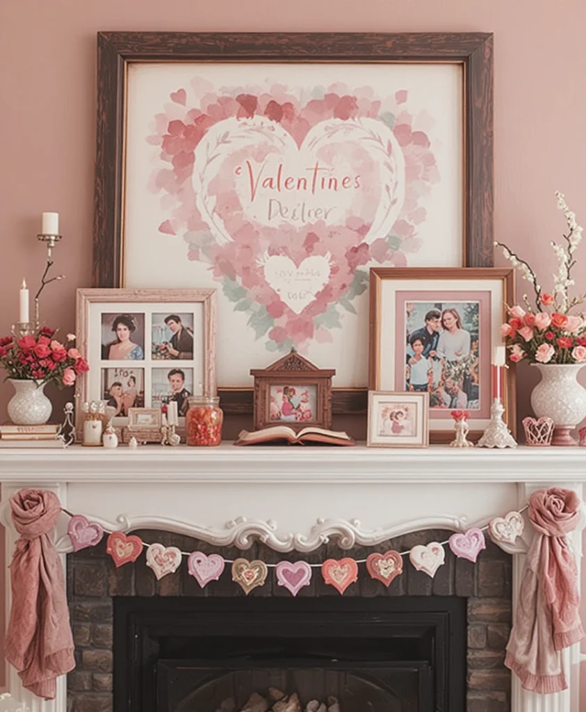 Infuse nostalgia into your valentine mantle decor by incorporating vintage frames, antique mirrors, and lace textures. Soft pastel artwork or handwritten love quotes complete the look. This approach feels personal and timeless, perfect for creating emotional warmth without relying on bold colors.