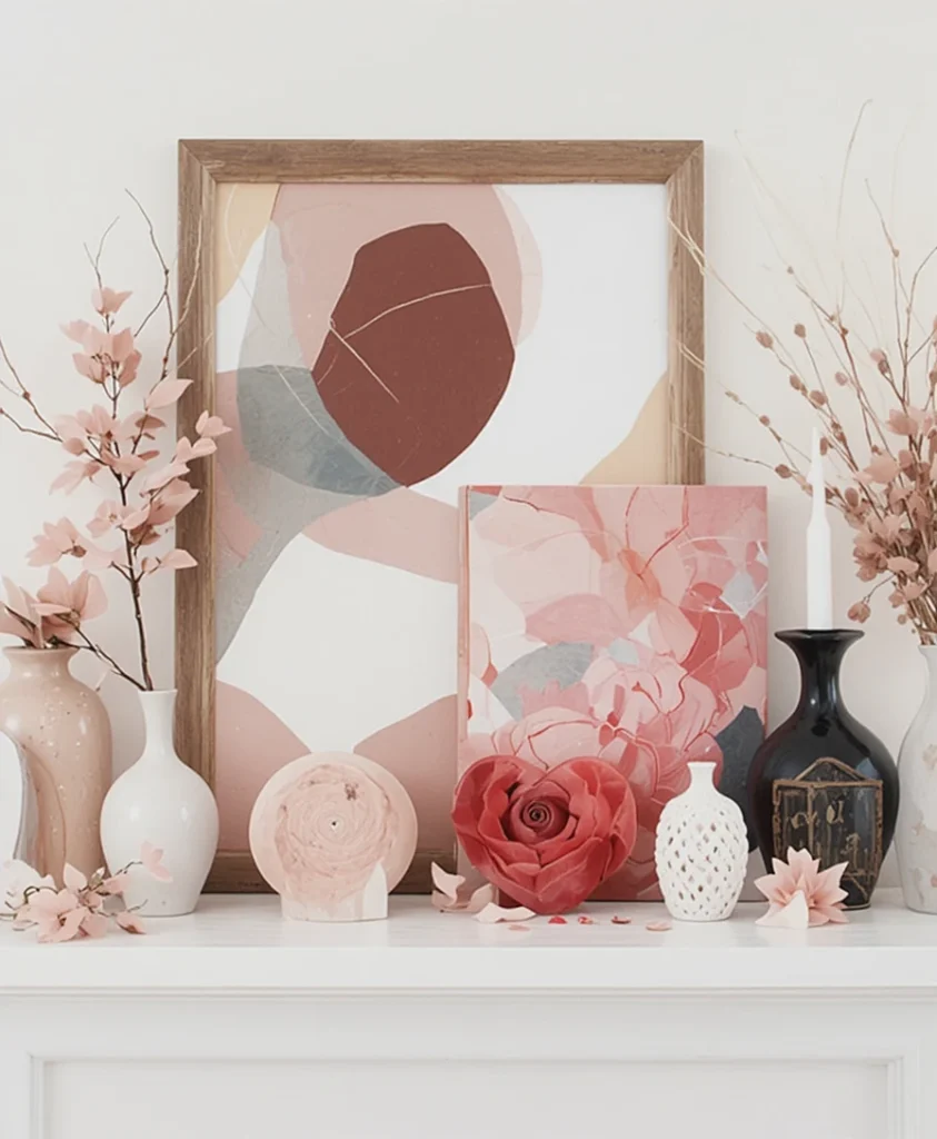 Showcase artistic elements such as abstract art, sculptural pieces, or hand-crafted décor. This valentine mantle decor idea appeals to modern interiors and allows creativity to shine. The artistic focus keeps the display unique and visually stimulating.