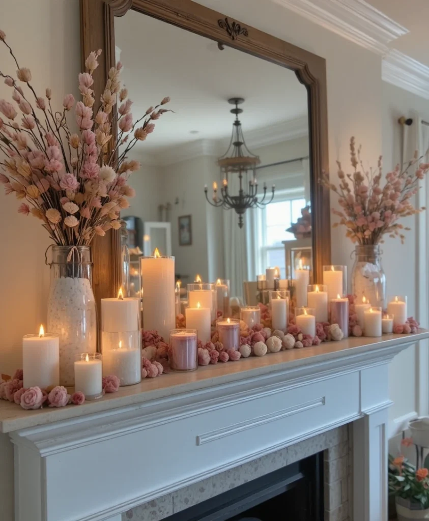 Create intimacy through layered lighting by filling your mantel with candles of varying heights. This valentine mantle decor idea uses pillar candles, tea lights, and lanterns to cast a warm glow that feels cozy and romantic. The flickering light enhances evening ambiance and pairs beautifully with minimal décor elements.
