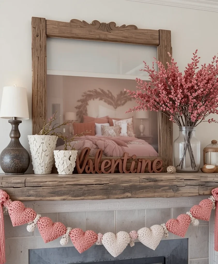 Natural textures shine in this cozy valentine mantle decor style. Wooden frames, distressed finishes, and soft fabrics come together to create warmth and authenticity. Add muted red or blush elements sparingly to maintain balance while still embracing the Valentine theme.