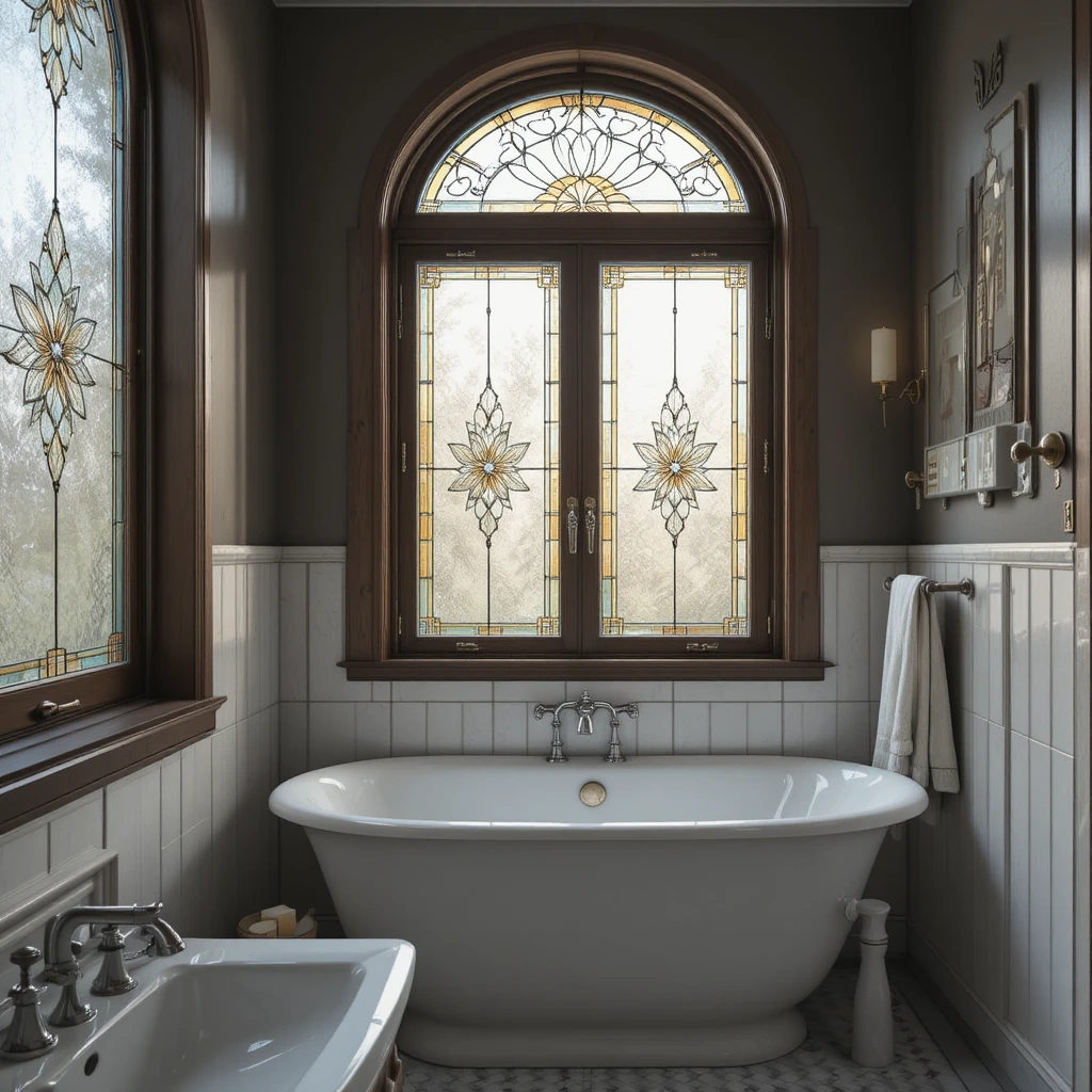 Install stained glass inserts or frosted designs that resemble retro artistry. These windows add privacy while elevating the beauty of natural light. A graceful way to enrich vintage bathroom style.
