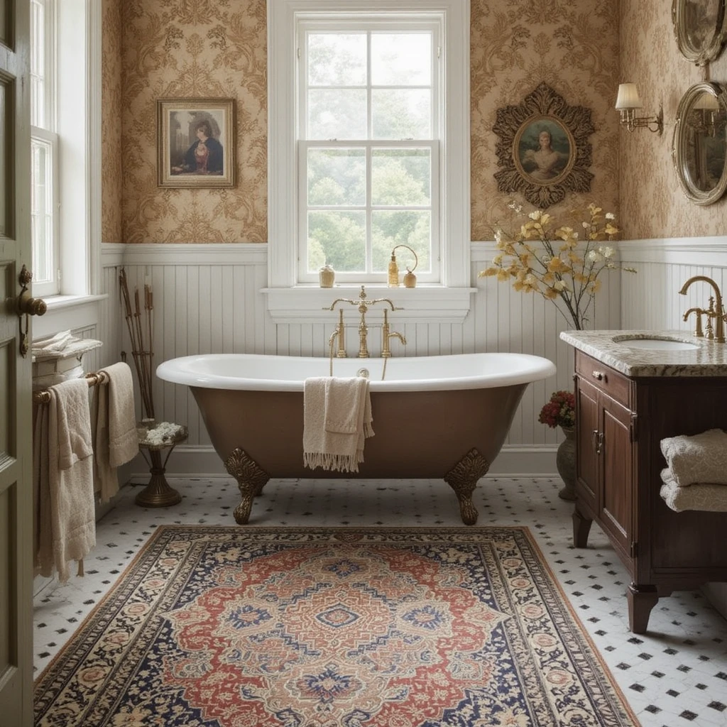 Swap typical bath mats for patterned Persian or Oriental-style rugs. These woven textiles infuse history and comfort underfoot while warming the room’s ambiance. A luxurious companion to your vintage bathroom style.