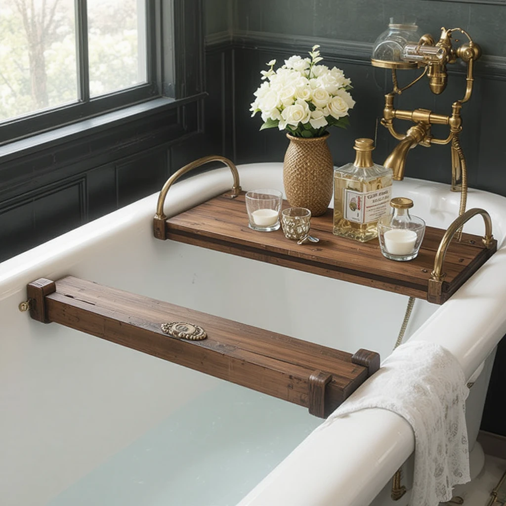 Use wooden or brass bathtub trays for a refined spa moment with a historic twist. They keep essentials within reach while complementing classic décor. A stylish and practical accent for a vintage bathroom style.