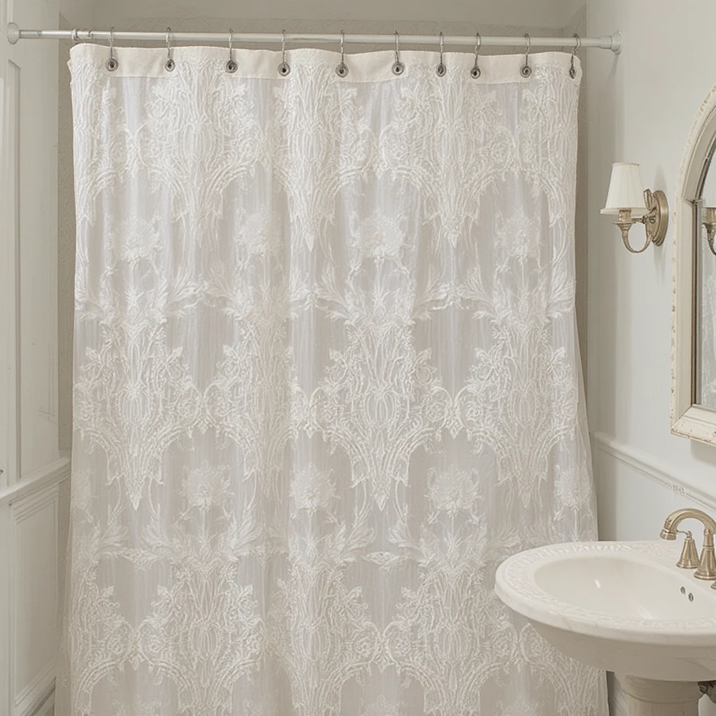 Use lace or damask shower curtains paired with curtain hooks for classic allure. These materials bring texture while softening the bathroom appearance. A romantic enhancement to vintage bathroom style aesthetics.