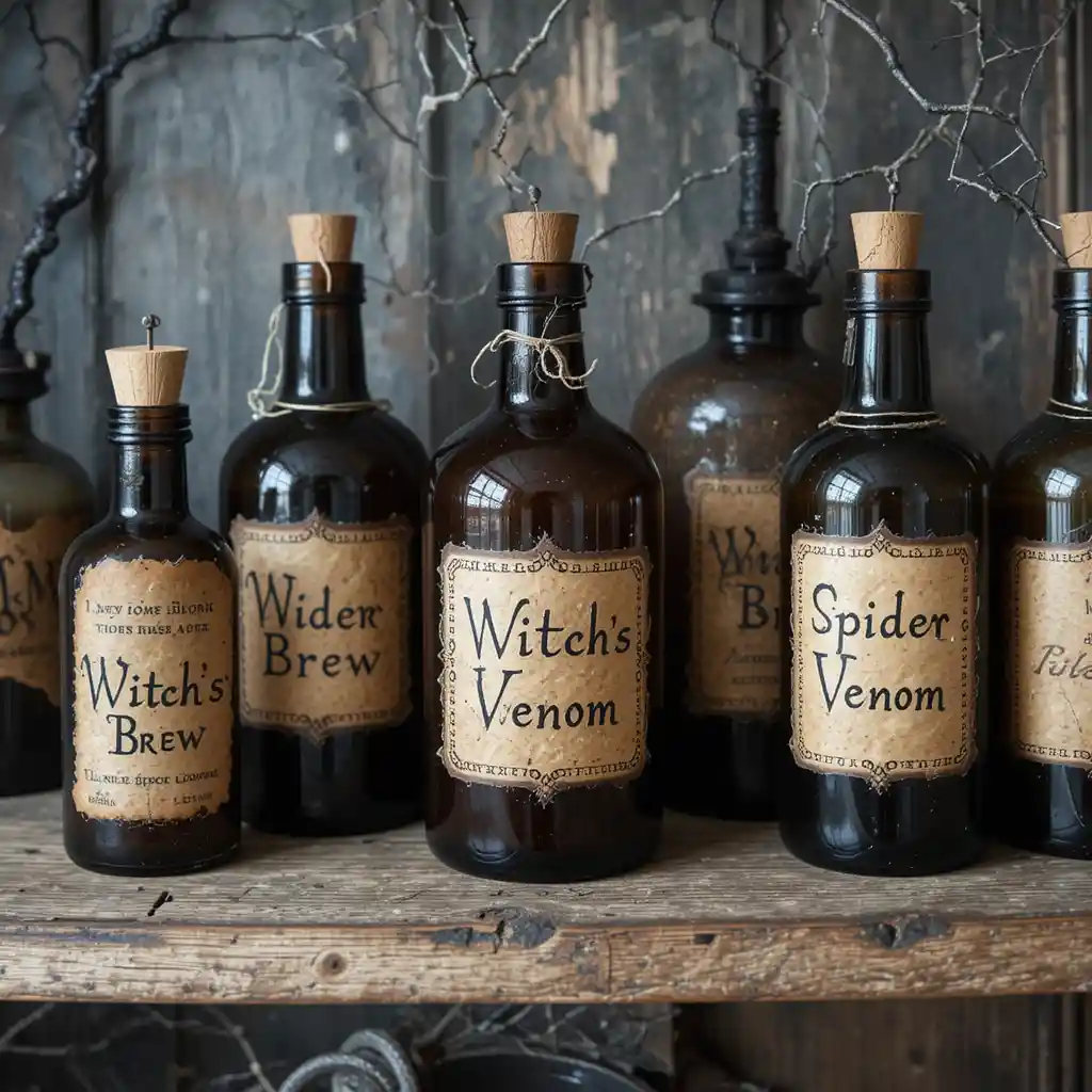 Repurpose old glass bottles with handwritten labels like “Witch’s Brew” or “Spider Venom.” Display them on shelves or dining tables for a witchy apothecary look.