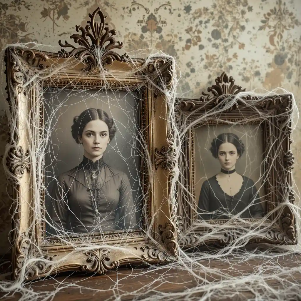 Take old family portraits or vintage-style prints, put them in distressed frames, and cover them lightly with fake cobwebs for an eerie haunted mansion effect.