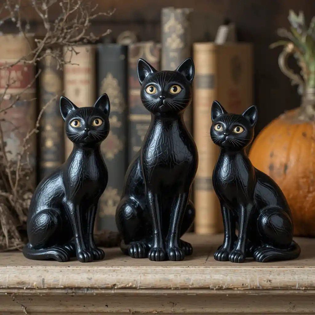 Black cats have always been Halloween icons, and vintage ceramic or cast-iron cat figurines bring back that old spooky charm. Place them on mantels or bookshelves for a mysterious vibe.