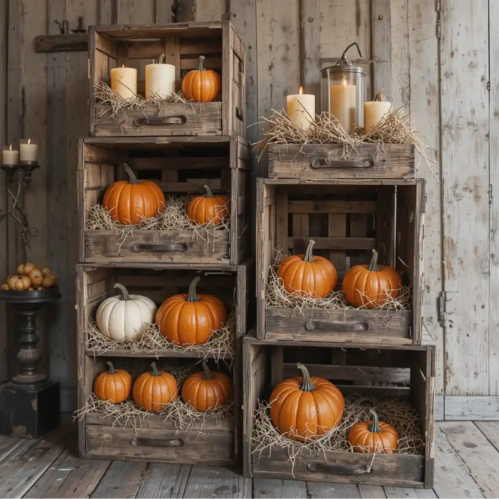Stack aged wooden crates and fill them with pumpkins, candles, and hay. This farmhouse-inspired idea feels both vintage and festive.