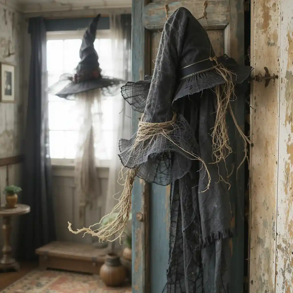 Instead of brand-new witch hats, go for ones that look faded or handmade. Hanging them on coat racks or doors adds a bewitching yet old-time look.