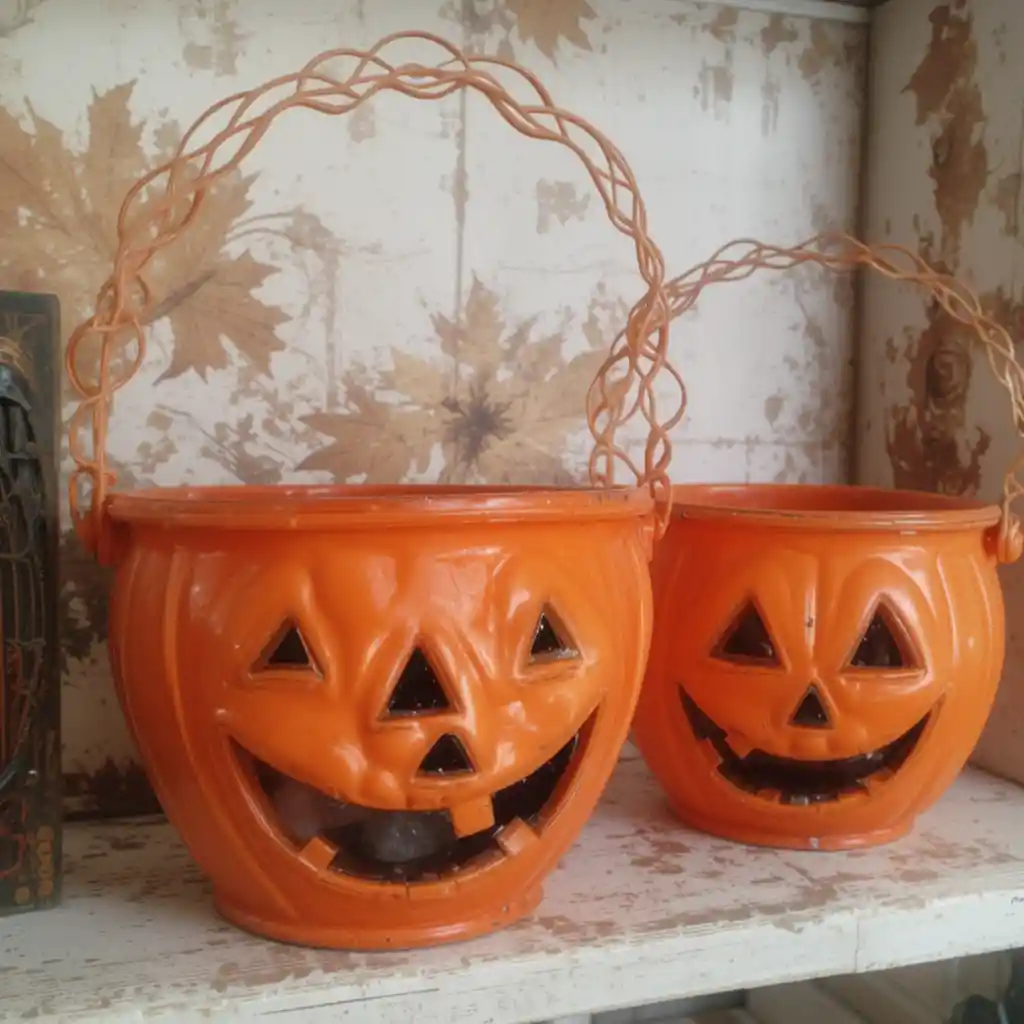 Those orange plastic pumpkin pails kids once carried are now vintage treasures. Use them as candy holders or place them on shelves for a nostalgic pop.